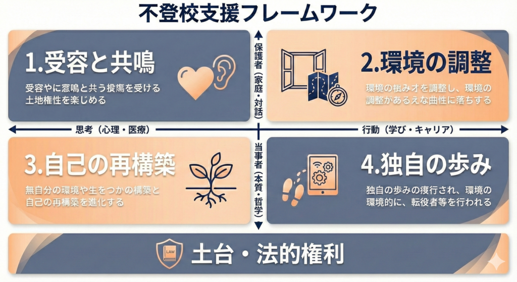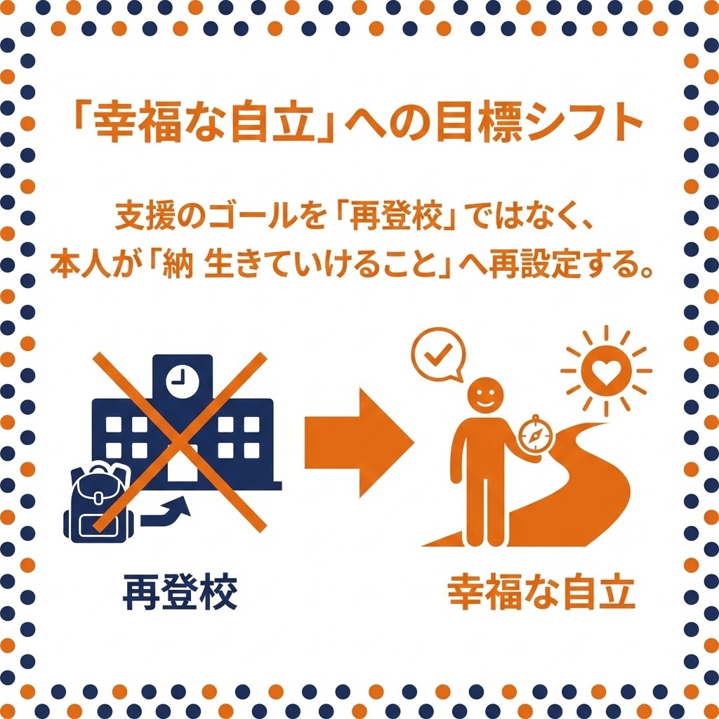 支援のゴールを「再登校」ではなく、本人が「納得して生きていけること」へ再設定する。学校という唯一の基準から離れることで、多様な学びや社会との繋がりを検討する心理的余裕を生み出す。