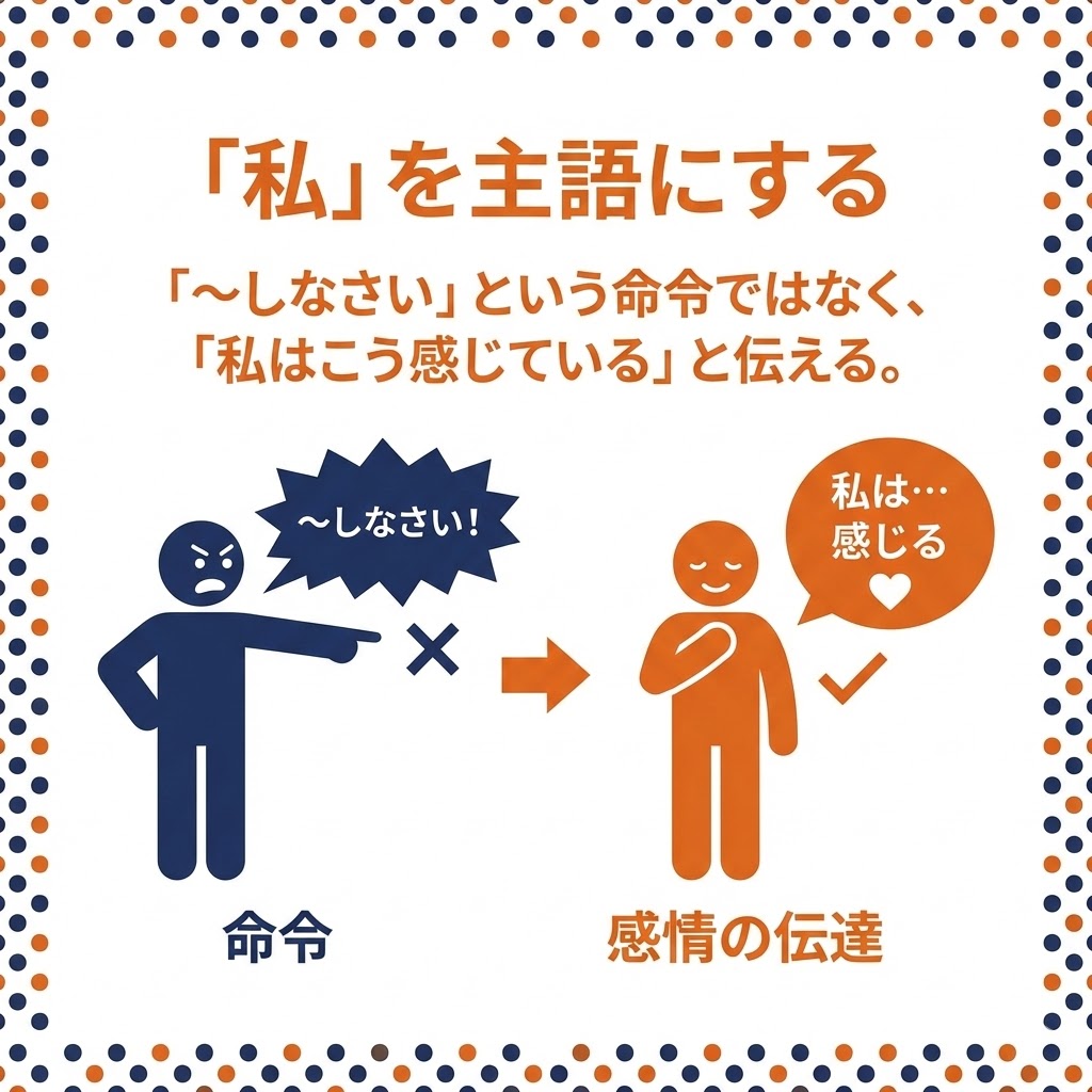「~しなさい」という命令ではなく、「私はこう感じている」と伝えることで、子どもの反発を抑えつつ親の想いを伝える 。