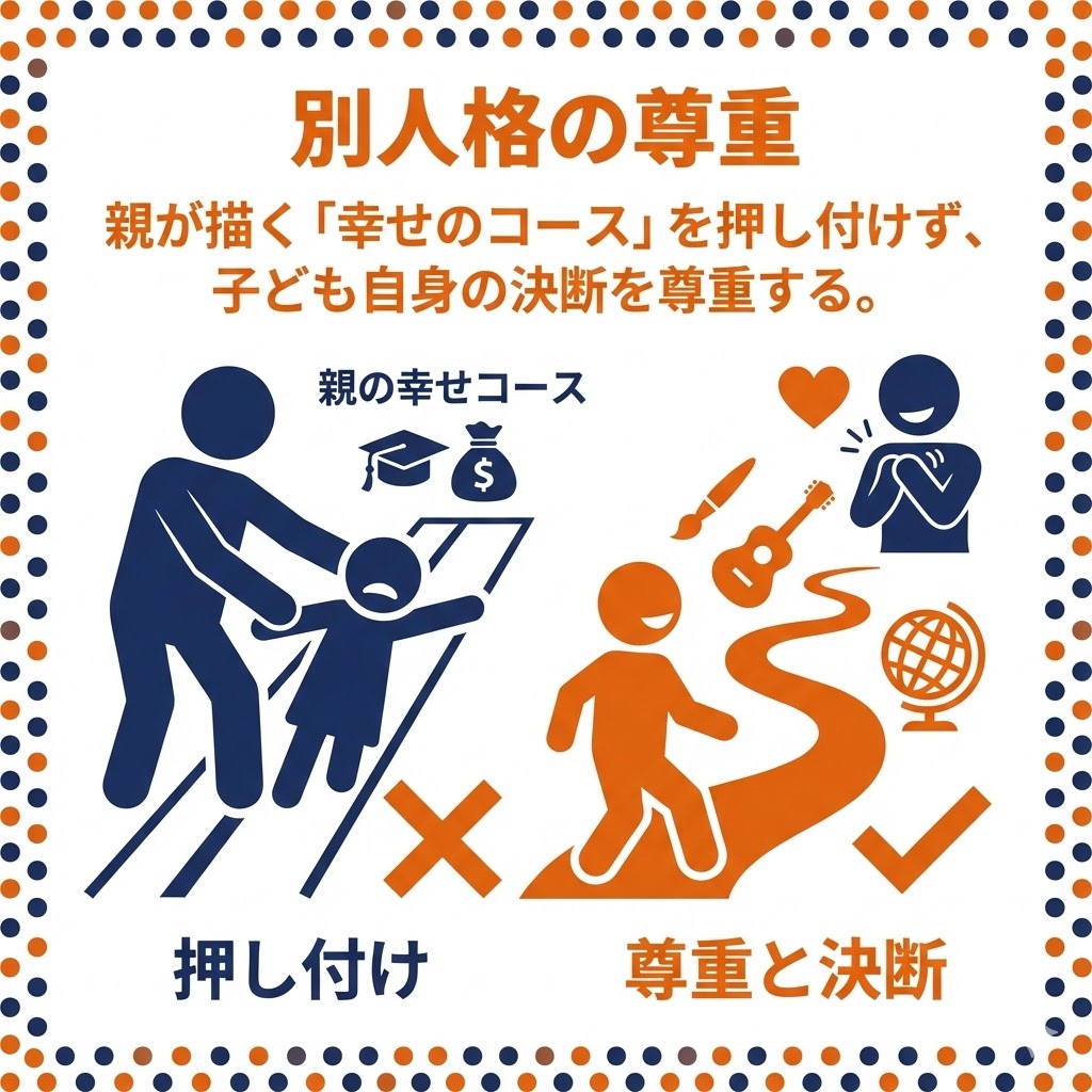 親子であっても価値観が異なることを認め、親が描く「幸せのコース」を押し付けず、子ども自身の決断を尊重する 。