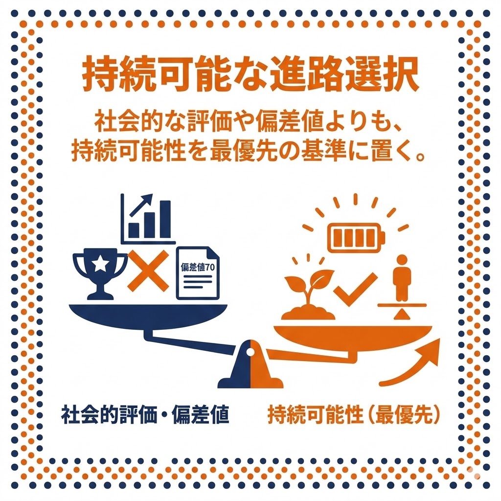 社会的な評価や偏差値よりも、「本人が無理なく通い続けられるか」という持続可能性を最優先の基準に置く 。進学をゴールではなく、長期的な自立に向けた一段階として捉える 。