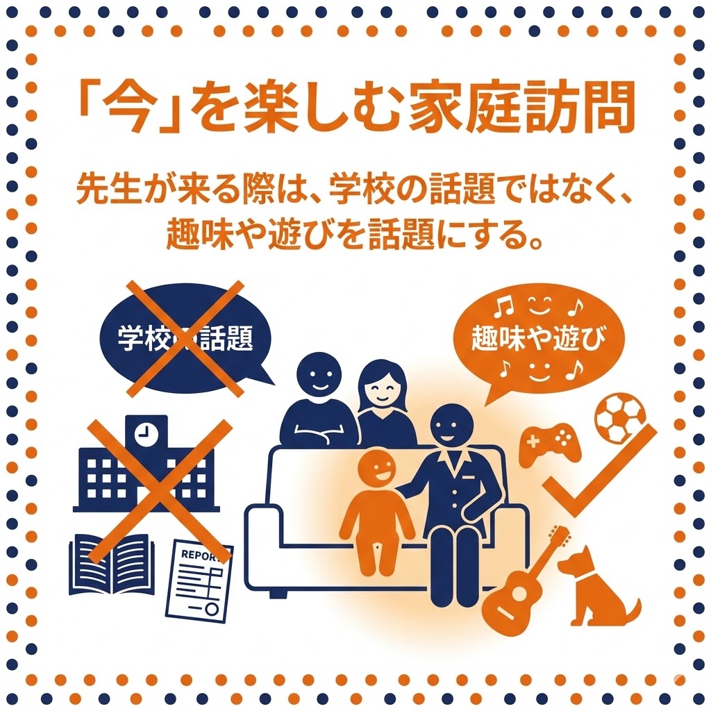 先生が来る際、学校の話題ではなく趣味や遊びを話題にして「楽しい時間」を過ごす 。