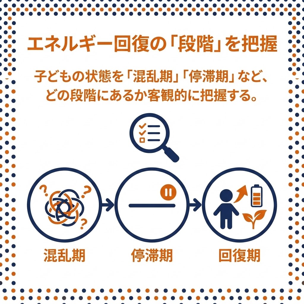 子どもの状態を「混乱期」「停滞期」など、どの段階にあるか客観的に把握する。回復プロセスを可視化することで、親の焦りによる過度な期待や、不適切な働きかけによる二次被害を防ぐ。