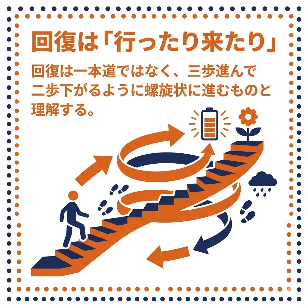 回復は一本道ではなく、三歩進んで二歩下がるように螺旋状に進むものと理解する。一進一退の状態を「停滞」ではなく「必要なプロセス」と捉え、あせらずに見守る姿勢を保つ。