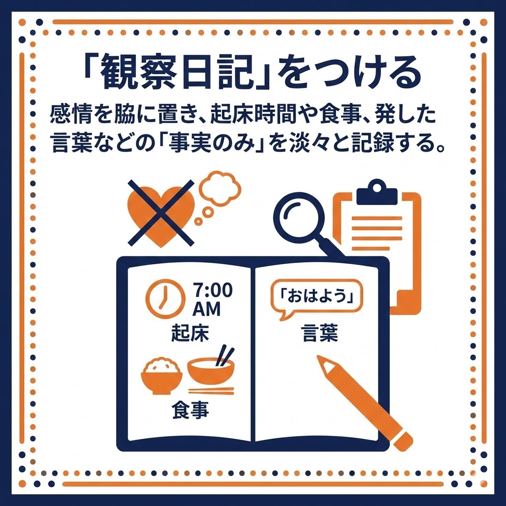 感情を脇に置き、起床時間や食事、発した言葉などの「事実のみ」を淡々と記録する。客観的なデータにより親の主観的な不安を分離し、子どもの本来のバイオリズムや小さな変化を正確に把握する。
