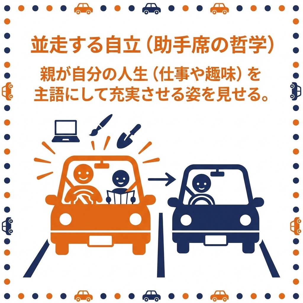 親が自分の人生(仕事や趣味)を主語にして充実させる姿を見せる 。親が自分の人生のハンドルを握ることで、子どもは「親の期待」という重荷から解放され、自身の人生を運転する心理的スペースを得る 。