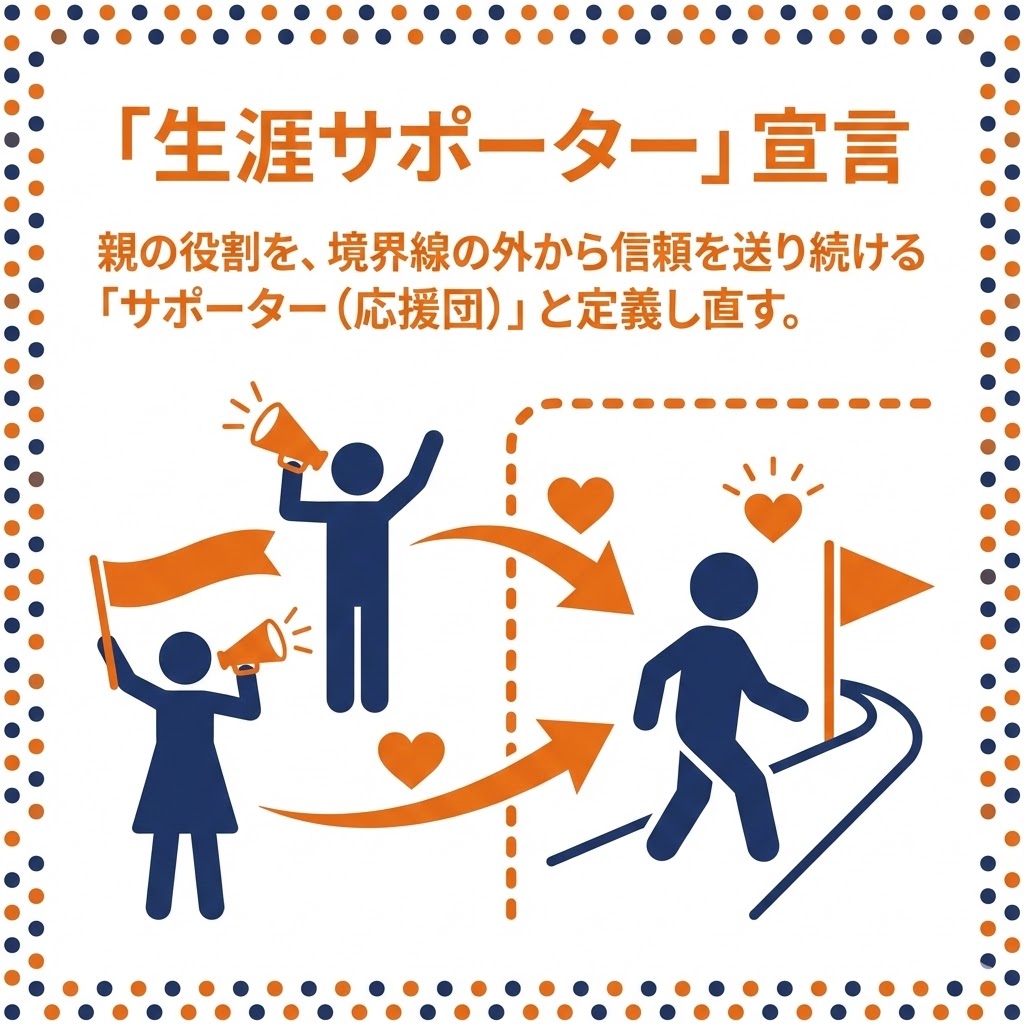 親の役割を、手出しをするヘルパーではなく、境界線の外から信頼を送り続ける「サポーター(応援団)」と定義し直す。相手のフィールドには乱入せず、信頼に基づいた見守りに徹することで、本人の主体性を守り抜く。